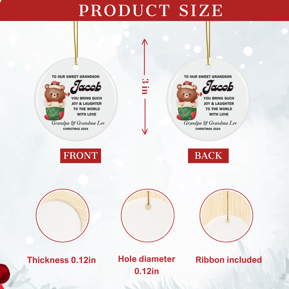 Celebrate this holiday season with a 2024 Personalized Grandson Christmas Ornament, a heartfelt keepsake crafted to honor the joy of your grandson’s first Christmas. Made from premium ceramic, this round ornament measures 3 inches in diameter with a sturdy 0.12-inch thickness, offering both elegance and durability. Designed with a pre-drilled 0.12-inch hole and decorative string, it’s easy to hang and display on any tree. Whether as a gift for your beloved grandson or a charming addition to your own decor, this Grandson Ornament is the perfect way to mark this special milestone.