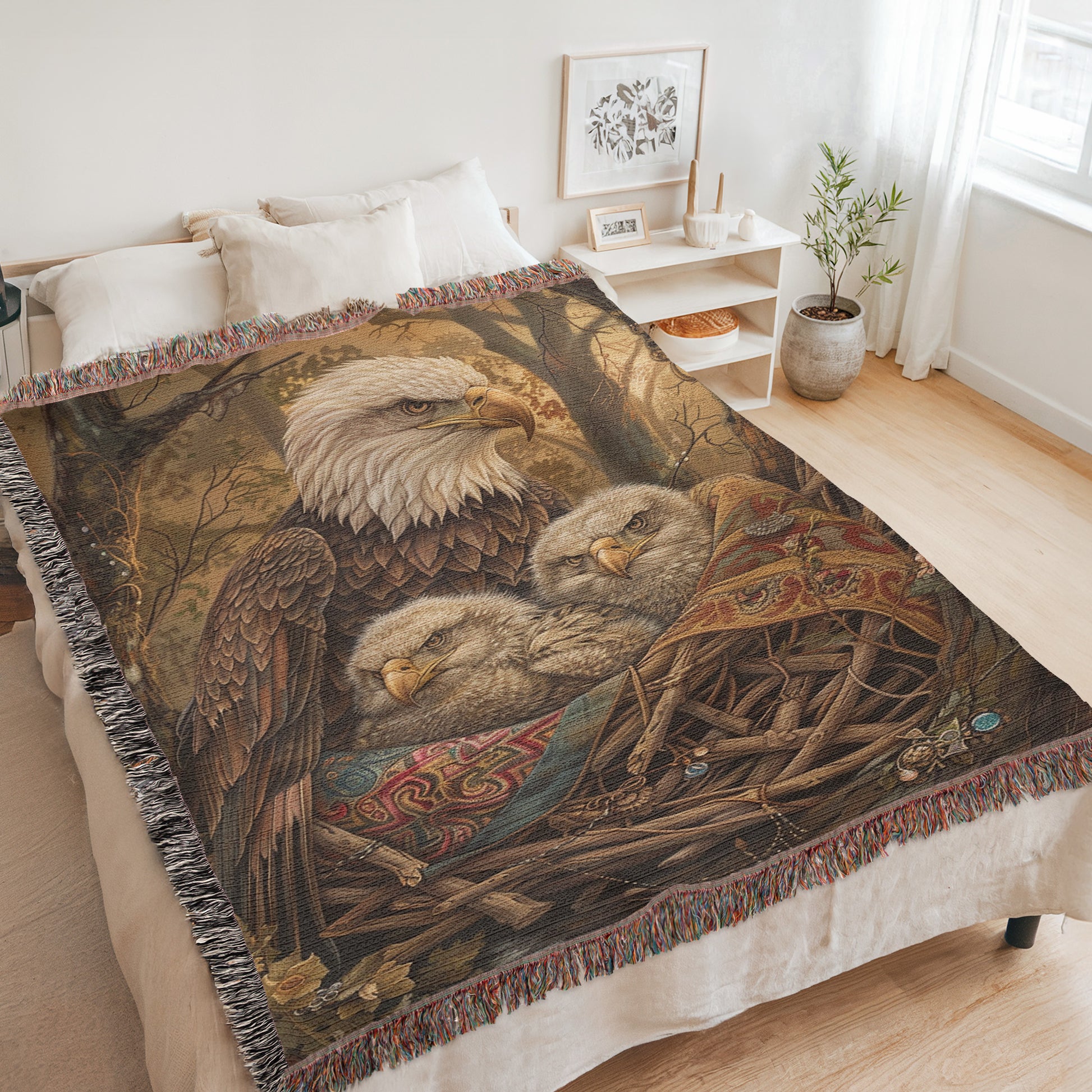 Celebrate the nurturing spirit of motherhood this Mother’s Day with our Eagle Mother’s Forest Woven Blanket! This touching throw captures a serene moment of an eagle mother warmly sheltering her three eaglets in a nest, nestled within a tranquil forest bathed in soft, warm light. Perfect for honoring the protective love of moms, this blanket symbolizes the deep bond between a mother and her children, making it an ideal Mother’s Day gift. Crafted from 100% cotton and expertly woven for a soft, breathable, and durable finish, it’s ideal for cozying up on chilly evenings, draping over your couch, or displaying as a piece of art. The fringed edges enhance its rustic charm, making it a versatile piece for both decor and comfort. Wrap yourself or a special mom in the loving imagery of an eagle mother sheltering her three eaglets in the forest with this stunning woven blanket, and let the spirit of Mother’s Day bring warmth and inspiration to your cozy moments.