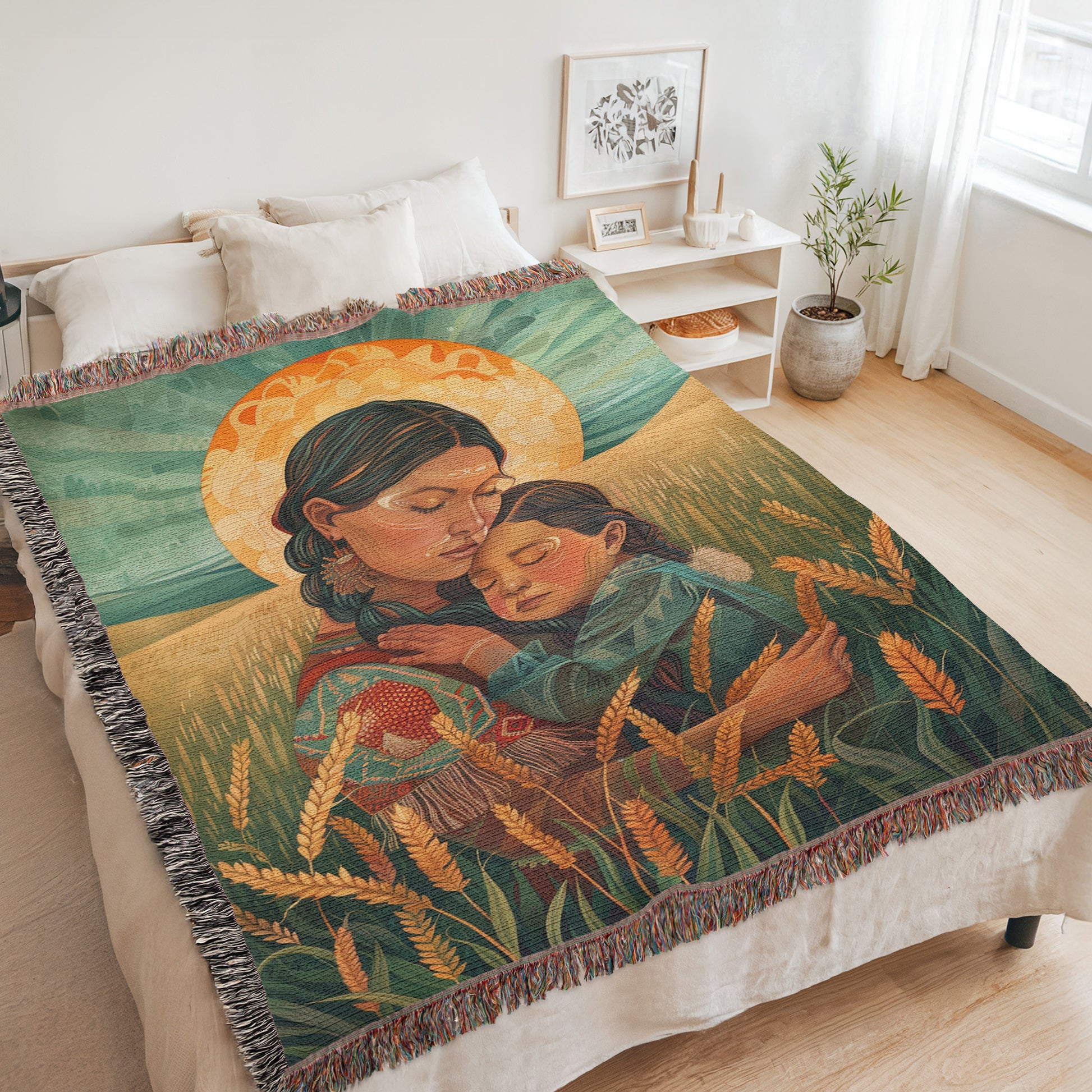 Celebrate the sacred bond of motherhood this Mother’s Day with our Native Mother’s Embrace Woven Blanket! This heartfelt throw captures a tender moment of a Native American mother holding her child in a field of tall grasses, with a glowing sun casting a warm, radiant light in the background. Perfect for honoring the deep love and connection between a mother and her child, this blanket makes a meaningful Mother’s Day gift that resonates with heritage and affection. Crafted from 100% cotton and expertly woven for a soft, breathable, and durable finish, it’s ideal for cozying up on chilly evenings, draping over your couch, or displaying as a piece of art. The fringed edges enhance its rustic charm, making it a versatile piece for both decor and comfort. Wrap yourself or a special mom in the loving imagery of a Native mother holding her child with this stunning woven blanket, and let the spirit of Mother’s Day bring warmth and cultural beauty to your cozy moments.