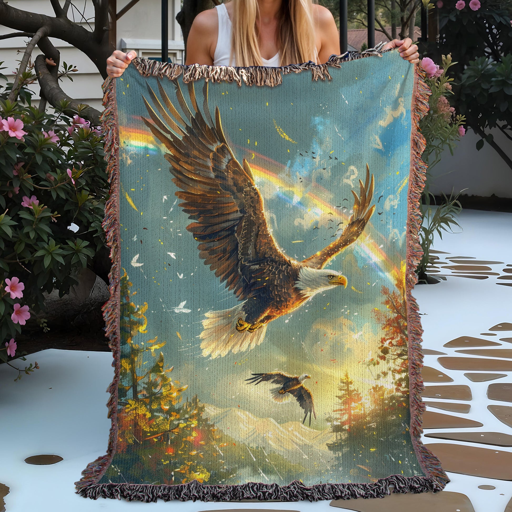 Honor the beauty of motherhood with our Rainbow Eagles Woven Blanket! This breathtaking throw captures a majestic eagle mother and her eaglet soaring gracefully through a vibrant rainbow, set against a stunning backdrop of a forested landscape with mountains and a glowing sky. Perfect for celebrating Mother’s Day, this blanket symbolizes the unbreakable bond between a mother and her child, making it a heartfelt gift for the special mom in your life. Crafted from 100% cotton and expertly woven for a soft, breathable, and durable finish, it’s ideal for cozying up on chilly evenings, draping over your couch, or displaying as a piece of art. The fringed edges enhance its rustic charm, making it a versatile piece for both decor and comfort. Wrap yourself in the inspiring imagery of an eagle mother and her eaglet soaring through a rainbow on Mother’s Day with this stunning woven blanket, and let the spirit of maternal love soar through your cozy moments.